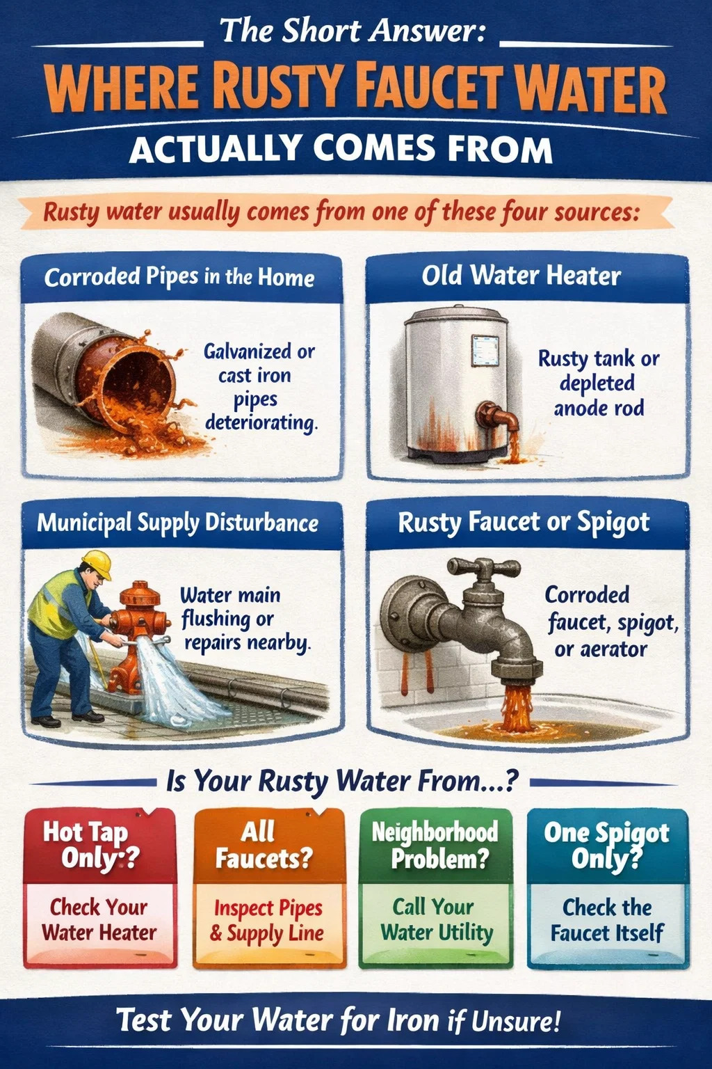 L'acqua arrugginita dei rubinetti è quasi sempre causata da una delle quattro fonti: tubi di ferro o acciaio corrosi all'interno della casa, uno scaldabagno in deterioramento, disturbi dei sedimenti nella linea di alimentazione comunale o un rubinetto o un dispositivo ossidato nel punto di erogazione. La tinta arancione, marrone o rossastra che vedi è ossido di ferro - ruggine - che si è sfaldato dall'interno dei tubi ed è entrato nel flusso d'acqua, oppure si è dissolto direttamente nell'acqua mentre viaggia attraverso infrastrutture obsolete.