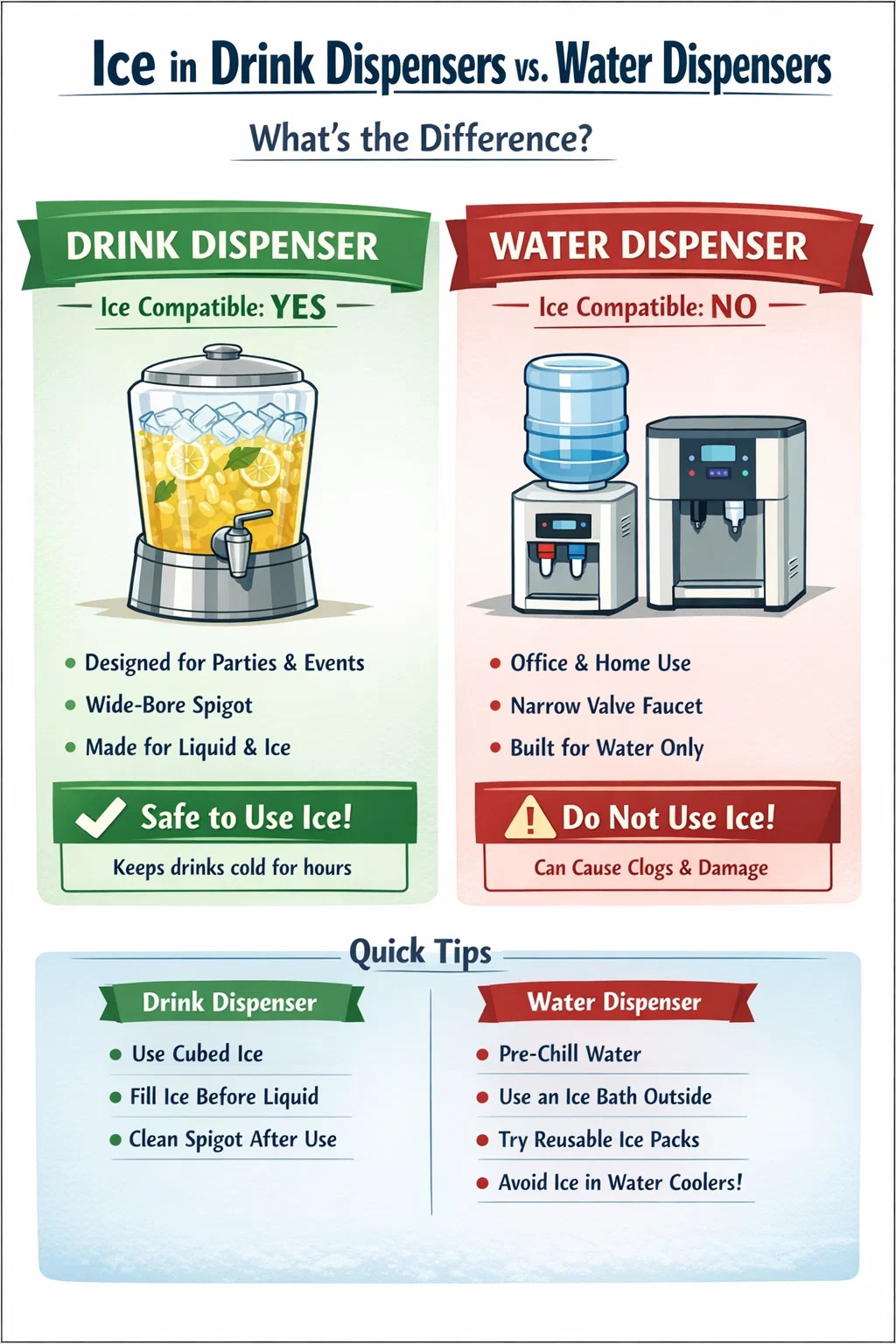 Un distributore d’acqua, d’altra parte, è un apparecchio autonomo – alimentato artificialmente o collegato – che riscalda o raffredda l’acqua utilizzando sistemi meccanici interni. Il rubinetto del distributore d'acqua è una valvola a molla o a pulsante progettata solo per acqua liquida. I tubi interni, le guarnizioni del serbatoio e i componenti del rubinetto dell'erogatore dell'acqua non sono costruiti per accogliere pezzi di ghiaccio che possono bloccare il flusso, espandersi quando si sciolgono in modo non uniforme o causare fluttuazioni di pressione all'interno del serbatoio.