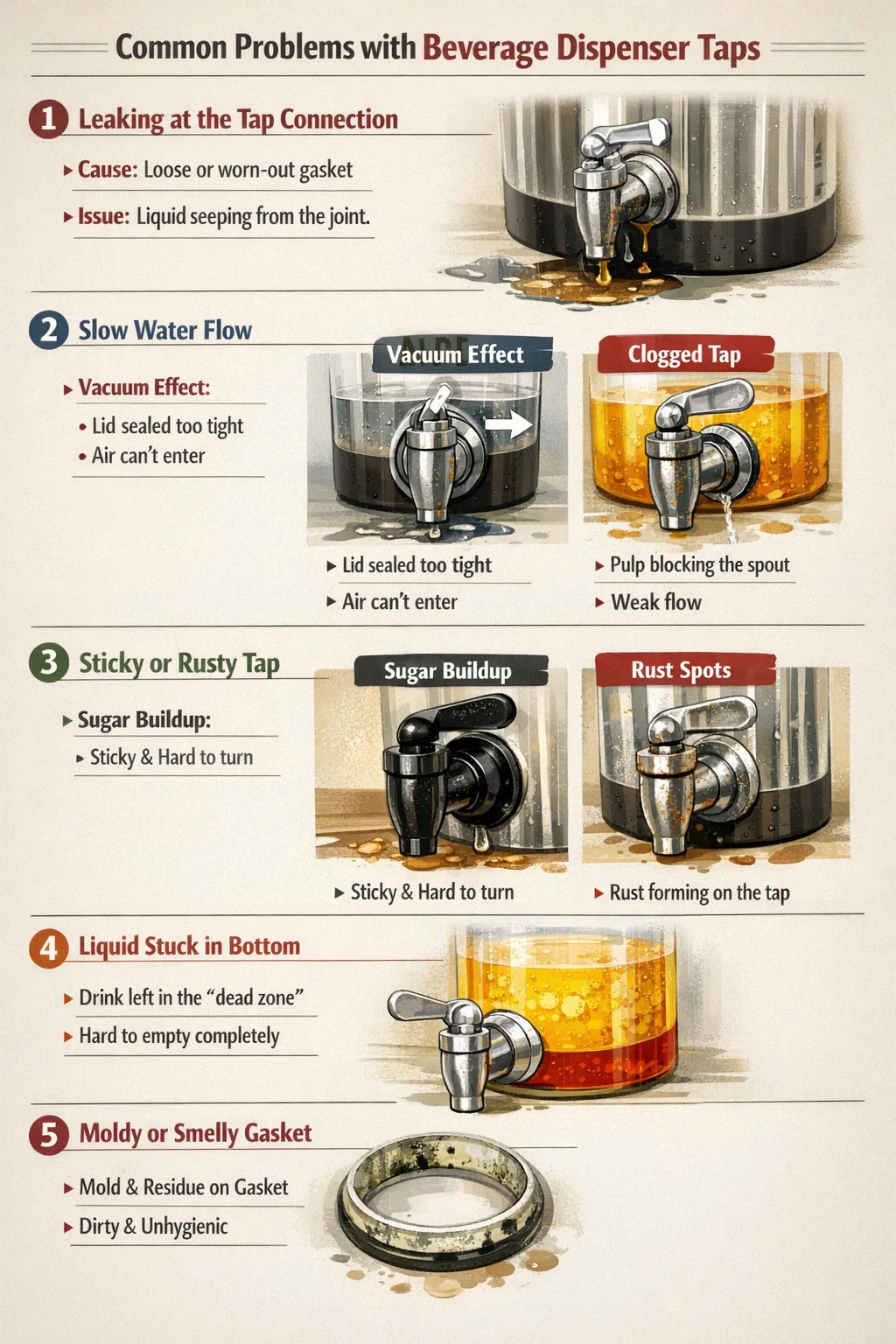 Quando si utilizzano i distributori di bevande, anche se sembrano semplici nel design, è possibile riscontrare alcuni piccoli problemi frustranti. Ciò è particolarmente vero per il componente principale: il Rubinetto per erogatore di bevande in metallo – che è più soggetto a problemi se non adeguatamente mantenuto.